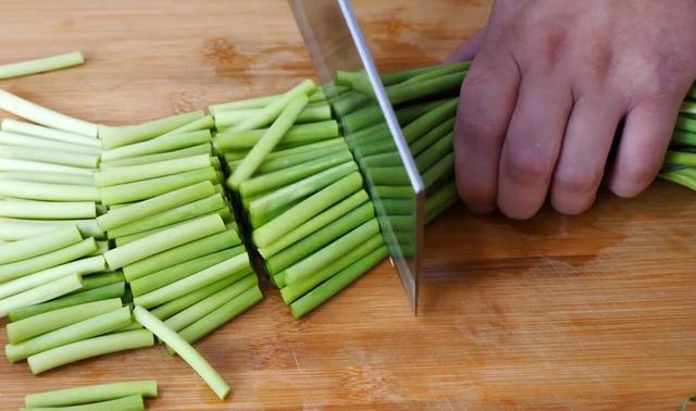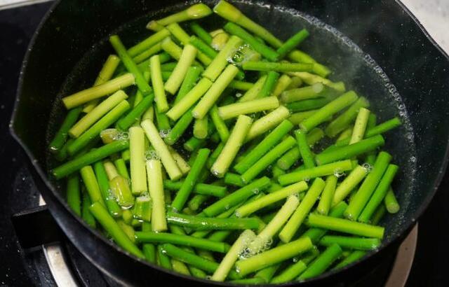 2、焯水后一定要放入清水中过凉,这样蒜苔颜色就不会变黄,还能保持蒜苔脆嫩的口感。