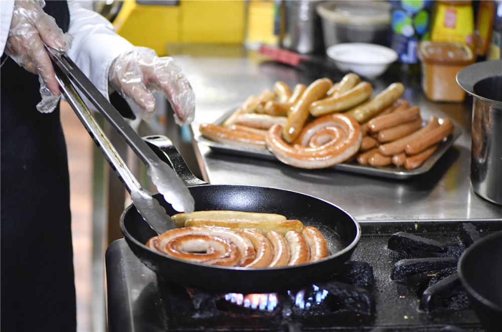 在吉林长春一家德国餐厅后厨,厨师在烹饪德国香肠。新华社记者许畅摄