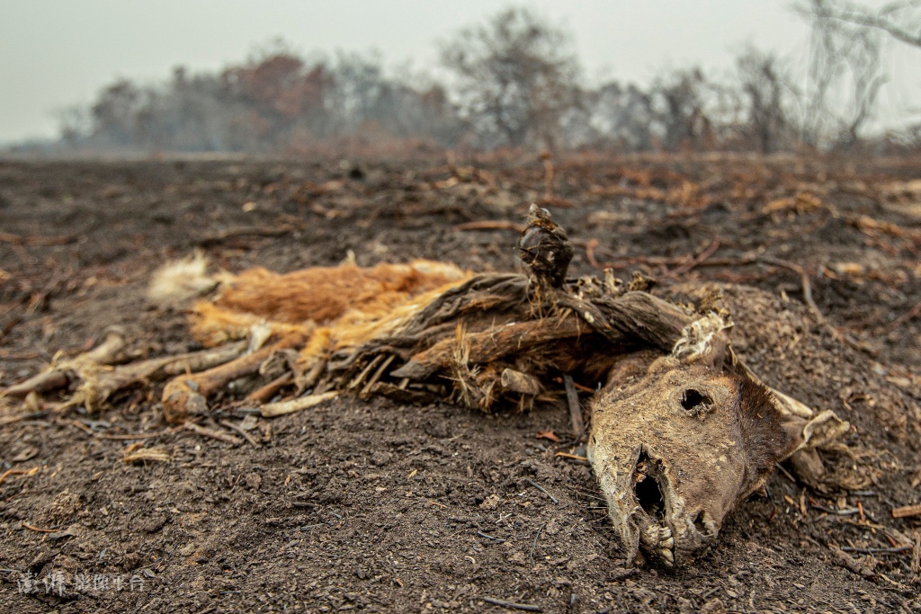 当地时间2020年9月18日,巴西马托格罗索州若夫里港,世界最大湿地潘塔纳尔湿地连日大火,过火面积达一千四百多万公顷,在这片湿地生存的生物多样性也受到严重的打击。随处可见烧焦的动物尸体。