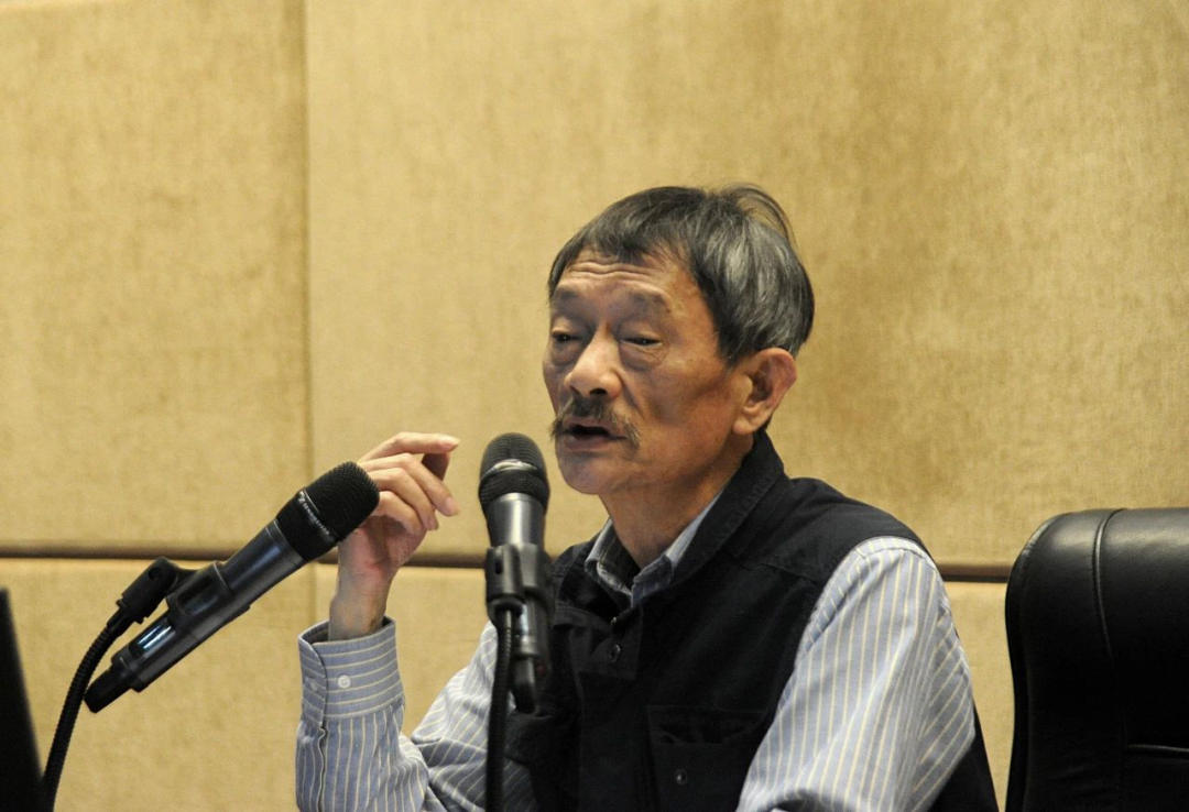 一位其貌不扬的老人坐在中国科学院大学讲台上,手拿发言稿讲话。