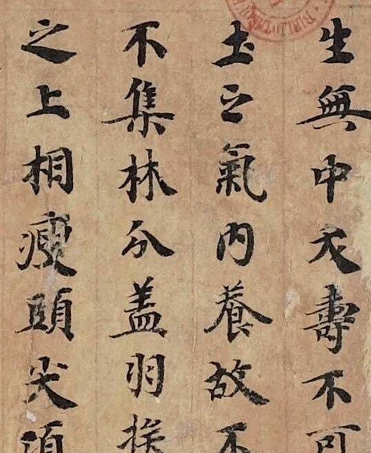 一是整齐划一。 楷书章法给人的第一感觉是整齐,字间距、行距,给人以稳定、庄重的视觉效果,类似于“台阁体”“馆阁体”的形式最适合严格意义上的楷书。结字的宽窄、长短的变化会产生局部细微的差别,把可能呆板拘谨的楷书变得生动活泼。