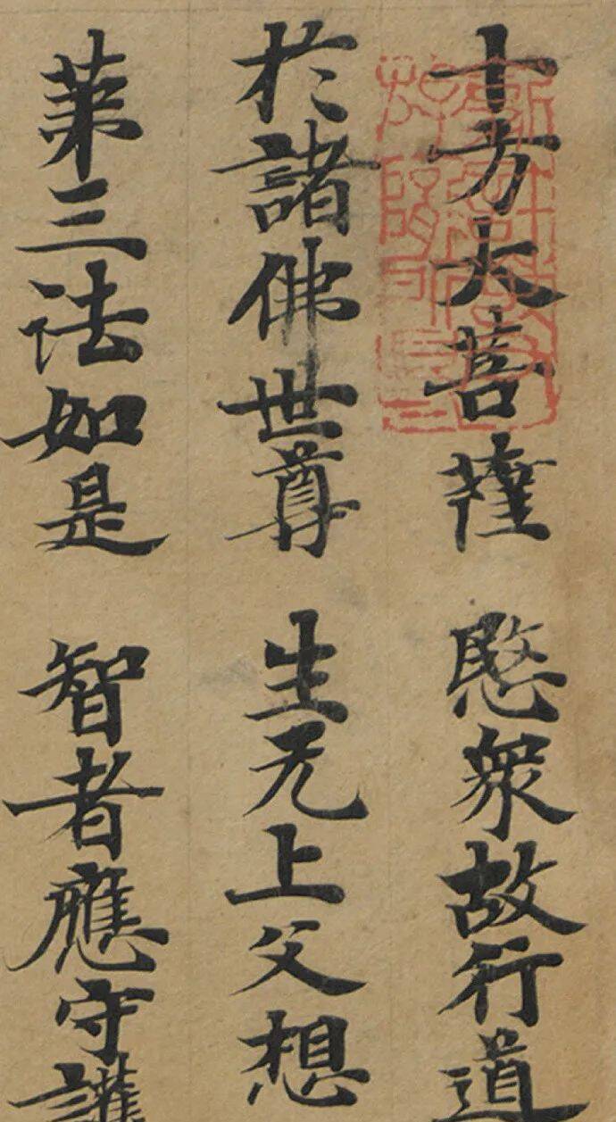 这是民间书法独具特色的章法形式,同时也符合时人的审美追求,在多样性与变化性的融合中显得十分和谐、统一,给人的感觉是静中有动、字中含情。这也是南朝写经书法带给我们的感染力。抄经人虽无名家书写的水准,但他们创造出了一种率真、自然的章法样式,这种自然闲适的创作风格值得后世不断进行临摹学习与吸收借鉴。