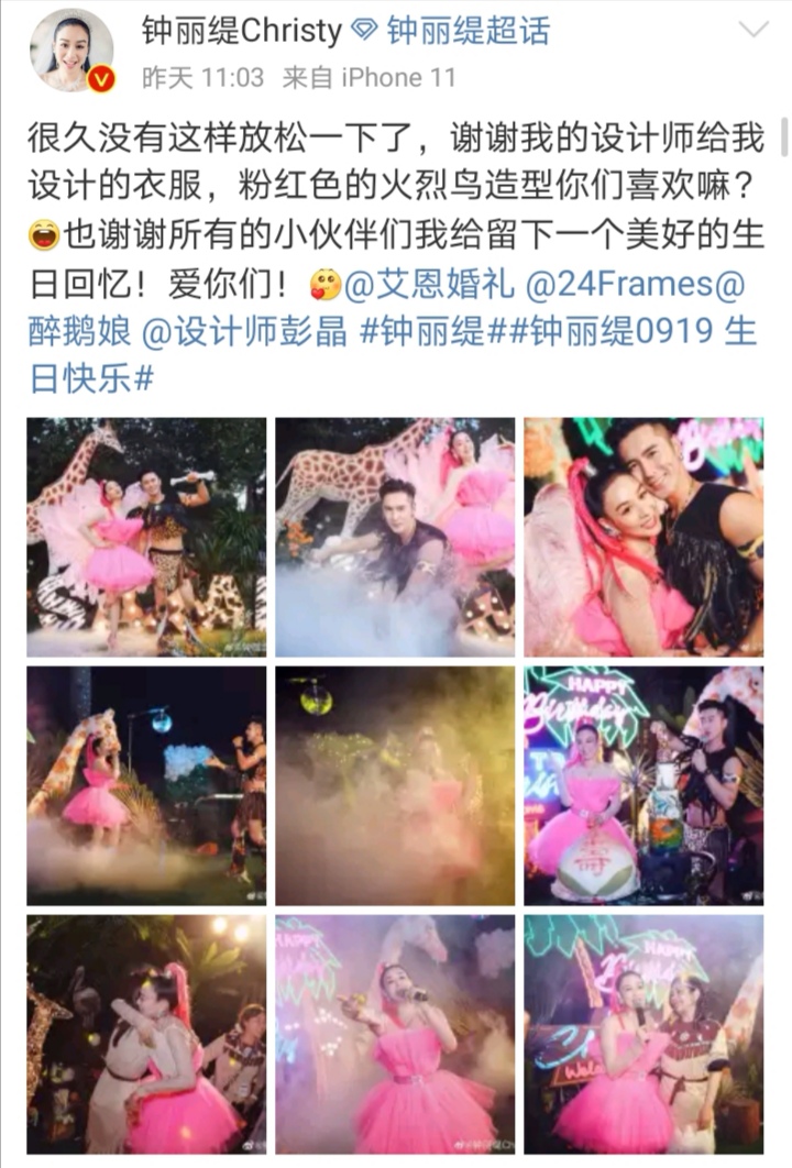 9月19日是“美人鱼”钟丽缇50岁的生日,钟丽缇在微博晒出生日派对的照片,表示很久没有这样放松一下了,感谢设计师给她设计的衣服,还反问大家“粉红色的火烈鸟造型你们喜欢嘛?”