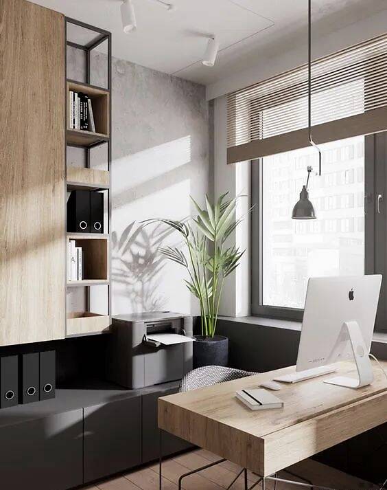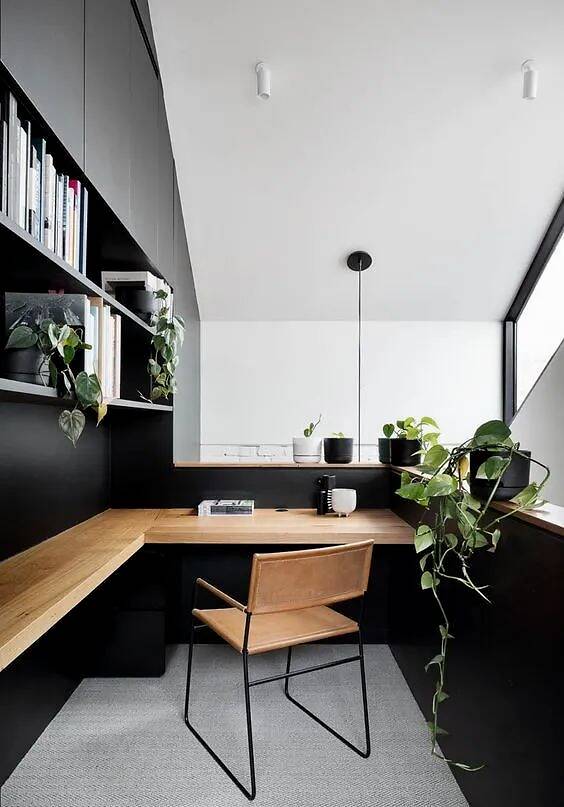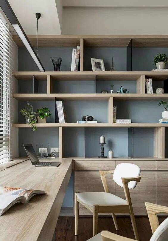 而L型的布局,则适用于长方形的书房空间,书桌与书柜呈直角状,留取一面空白墙,其整体占地面积小,且利用起来十分方便。