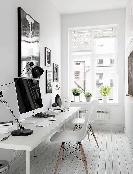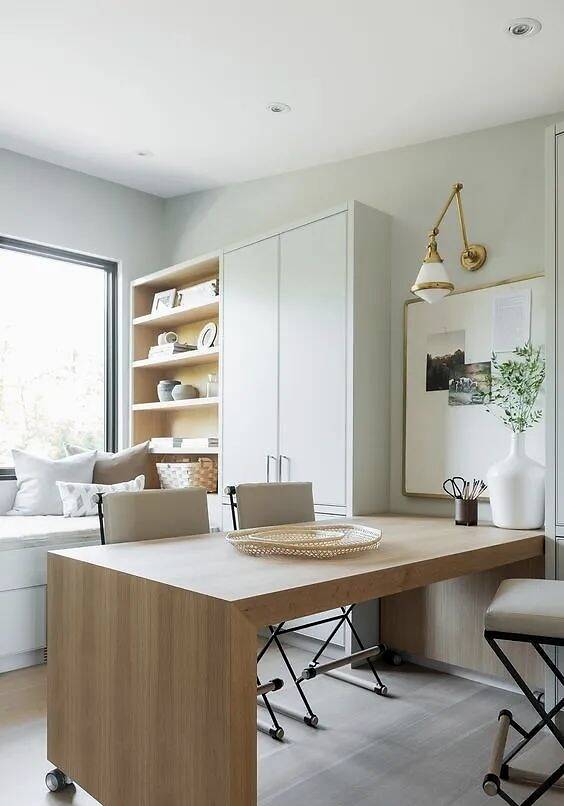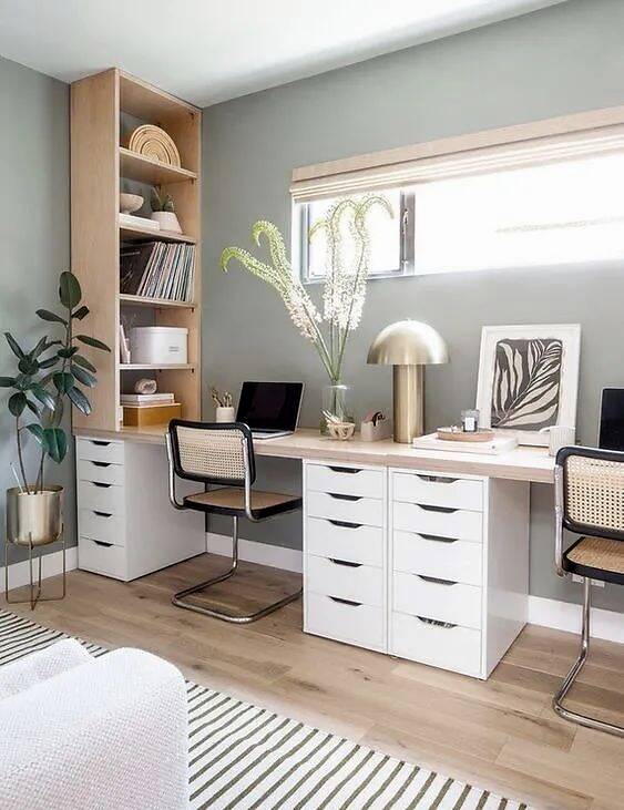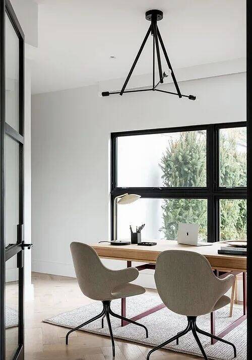 书房空间不独属于一人时,可根据使用人数进行书桌排布。常见方式有一字型摆放与T字型摆放两种。