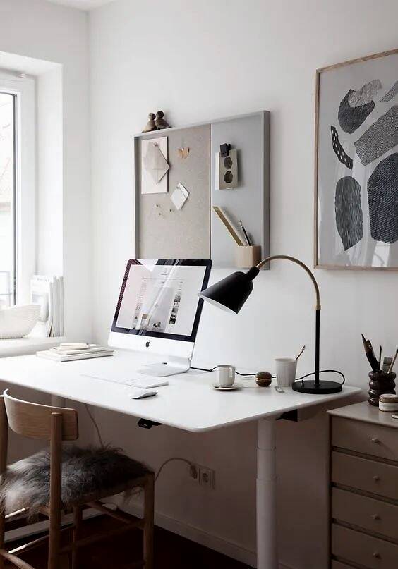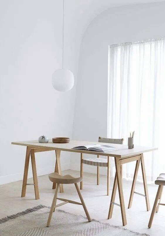 一字型分布时,多将书桌靠墙或者窗摆放,根据使用人数分布书桌即可;T字型摆放则是在靠墙的书柜/架中心点位置垂直延伸出书桌台面,并于延伸台面的两侧摆放椅子、沙发后便能使用。