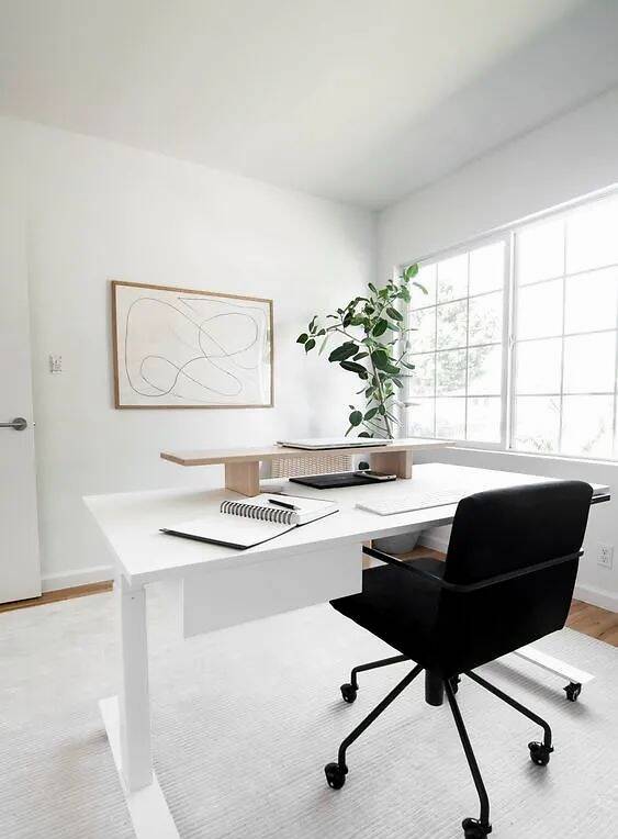 这样的布局方式适用于只求设计感,不求空间利用的屋主选择。大面积的留白设计,凸显书桌椅的重要性,简练、清晰的动线脉络赋予整个空间最为纯粹的功能与美学。