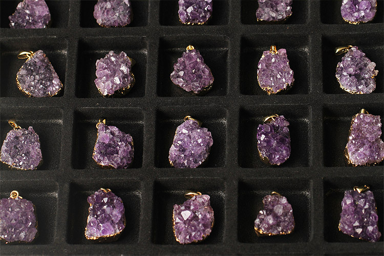 无色透明的天然水晶中由于渗入了微量铁元素,所以颜色呈紫色,这样的颜色在天然水晶中最显高贵,一般紫水晶的底色不均,因此整体颜色较深、色泽统一的紫水晶更为优质。