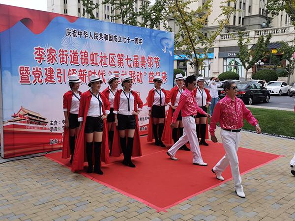 老年模特队走秀、民族舞表演、互动问答……临近国庆节,辽宁省大连市沙河口区李家街道锦虹社区门口热闹非凡,原来这是锦虹社区正在举办第七届美邻节暨庆祝中华人民共和国成立七十一周年的文艺汇演活动。