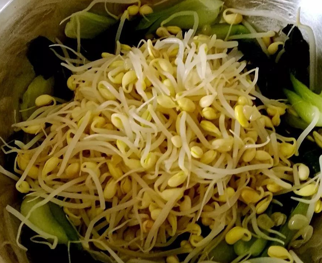 2、然后把油菜 黄豆芽 焯水断生后 放在盆底,炒锅放油烧熟 爆香花椒和红辣椒后滤出备用 留底油,加郫县豆瓣酱 蒜片 姜片 炒出红油,加鱼头 鱼尾 鱼骨 炒至肉色变白 烹入料酒;