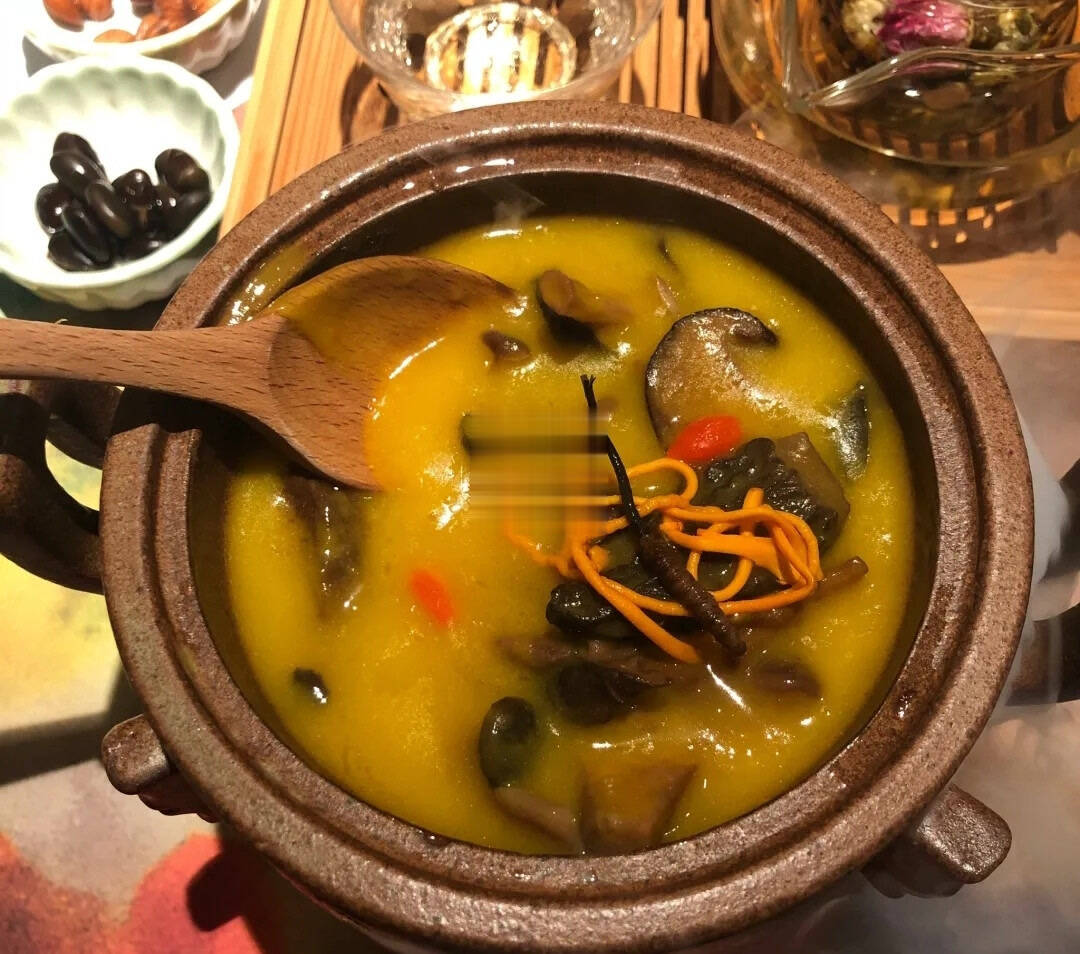 2.鸽蛋煮熟,大瑶柱、干虫草花、干花菇泡软,与泡发好的食材一起备齐。用鲜鸡汤倒入砂锅浸泡一夜,使味道更加浓郁。一般的海味干货食材用大葱、生姜和200克古越龙山花雕酒和450克纯净水煮开,焯水去除腥味备用。