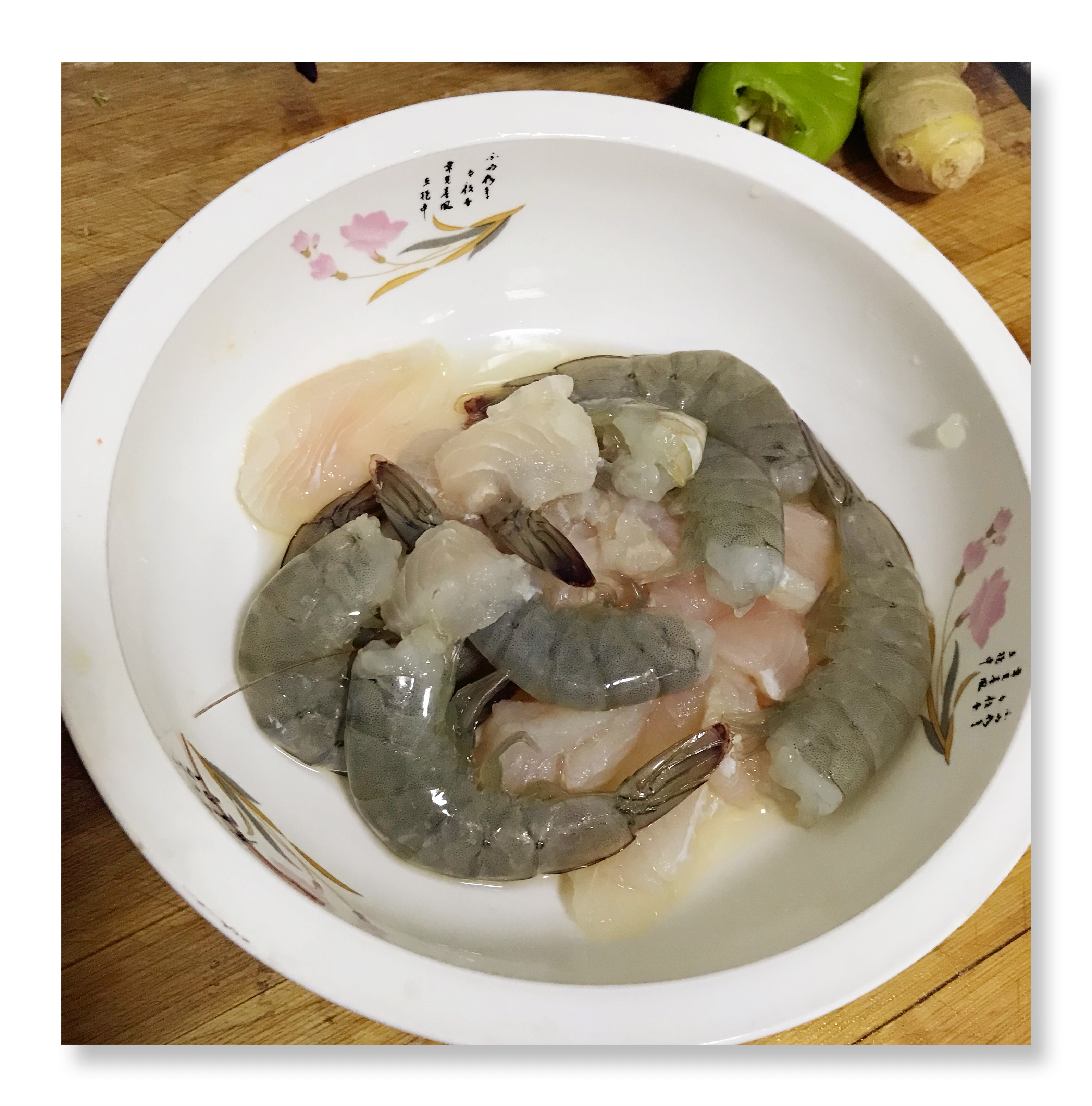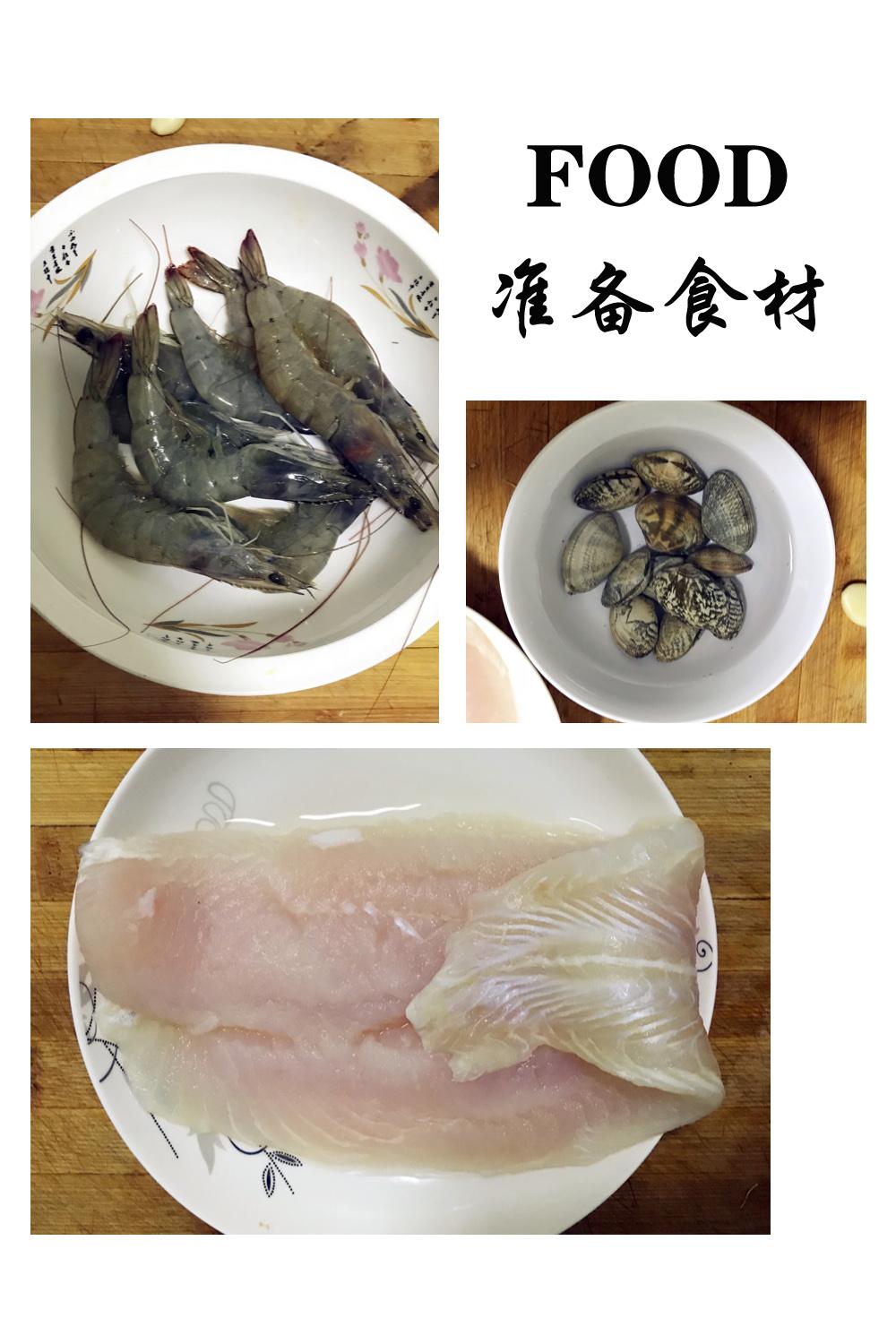 食材准备(2~3人份):鲜虾6~8个、龙利鱼1块、花蛤若干、小青菜、大米、生姜、料酒、食盐