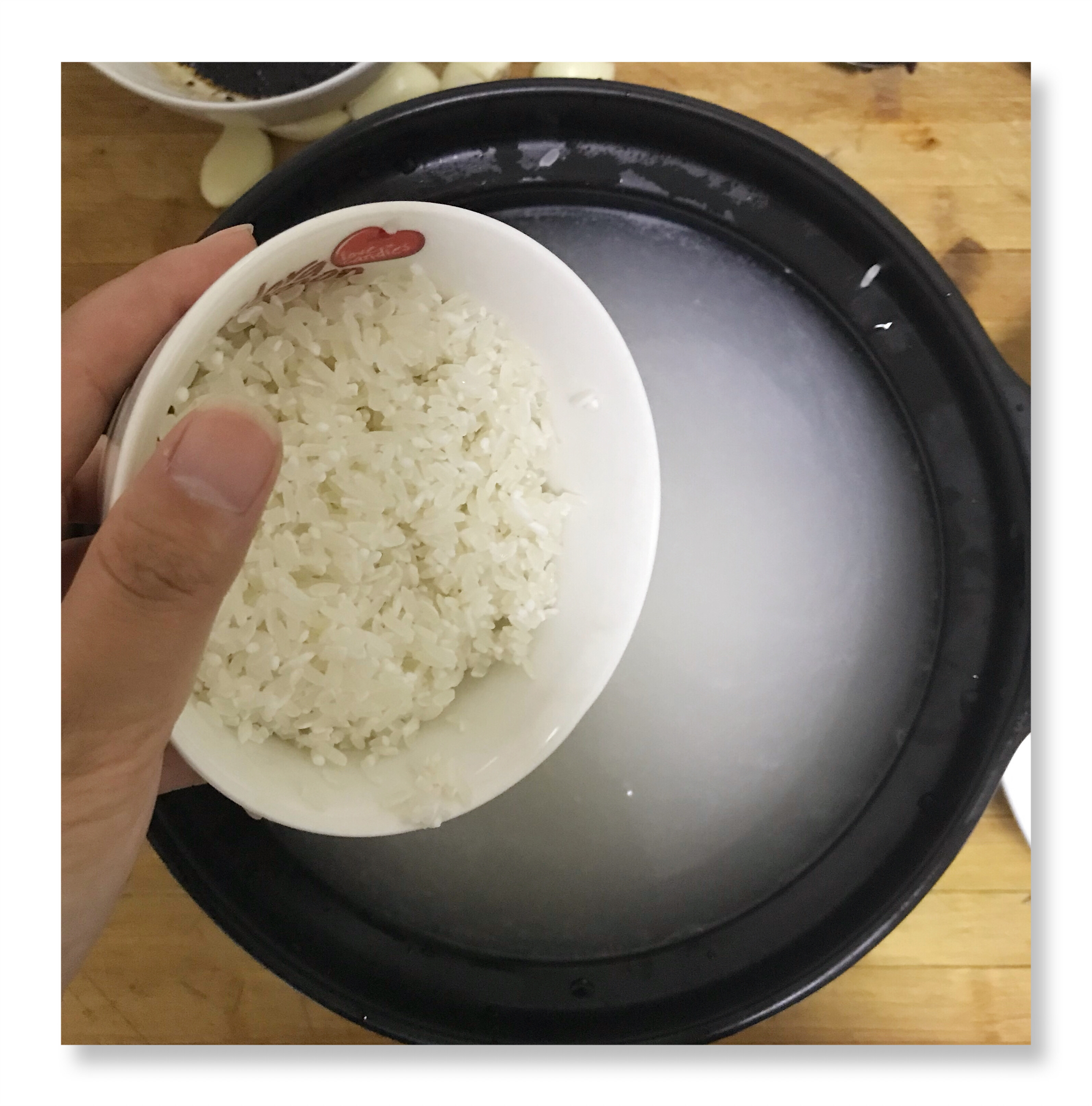 5、淘米煮粥:取一碗大米淘干净(尽量提前浸泡半小时)放入砂锅中,加入清水,米与水为1:6的比例,大火煮开转至小火慢炖;