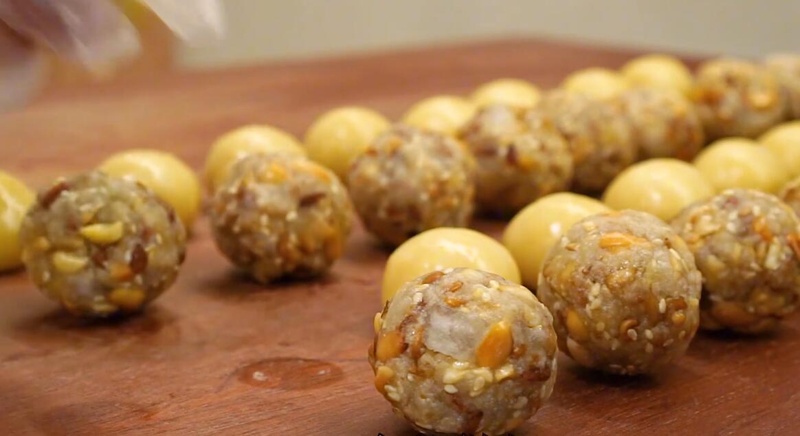 3、12分钟后打开烤箱,取出烤好的干果,再将干果切得小一些,带有一些小颗粒就行,然后再准备一些冬瓜糖,也切成小颗粒,再加入15g白糖、20g白芝麻、30g食用油、少量清水、少量糯米粉,用筷子搅拌均匀放置30分钟;30分钟后用手直接捏成圆球,馅料一个30g左右,再将面团捏成一个20g左右,全部捏好之后放置一旁备用;