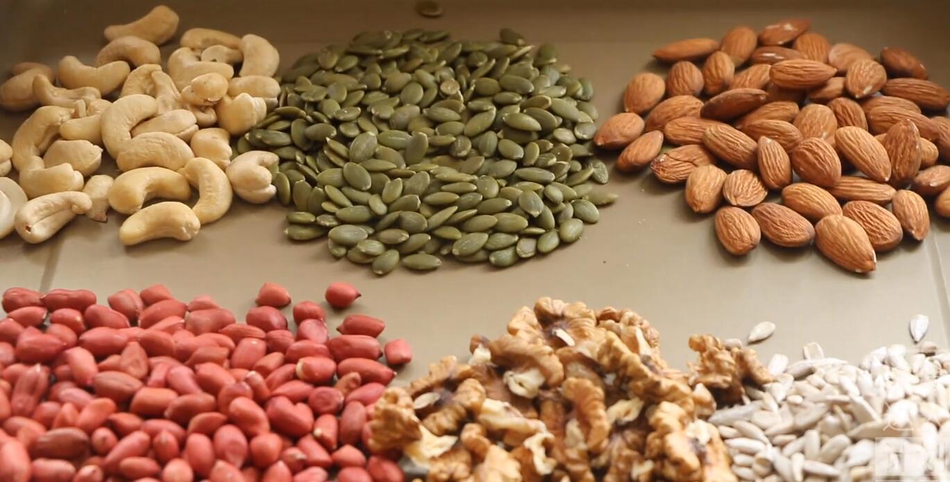 食材准备:鸡蛋、花生、核桃、南瓜籽、杏仁、腰果、瓜子、转化糖浆、碱水、面粉、冬瓜糖、白糖、白芝麻、糯米粉、食用油