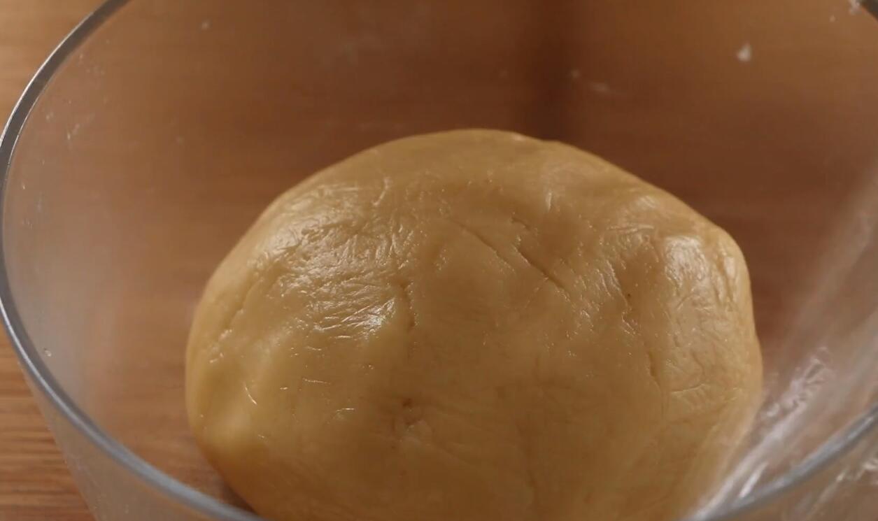 2、准备一个碗,碗中加入100g转化糖浆、2g碱水、35g食用油,搅拌均匀后倒入300g面粉,翻拌均匀后用手揉搓成光滑的面团,然后放入碗中盖上保鲜膜,放置一旁给面团醒发一个小时;