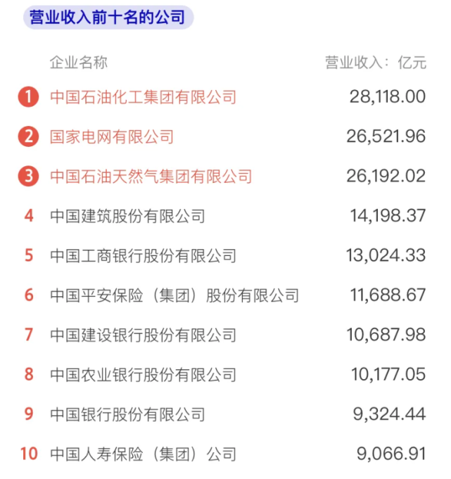 2020年中国企业500强中,中国石油化工集团有限公司以2.81万亿营收排名第一,国家电网有限公司与中国石油天然气集团有限公司分列二三位,营收总额分别为2.65万亿、2.62万亿。中国建筑股份有限公司,中国工商银行股份有限公司,中国平安保险(集团)股份有限公司,中国建设银行股份有限公司,中国农业银行股份有限公司,中国银行股份有限公司,中国人寿(集团)公司分列第四到第十位。