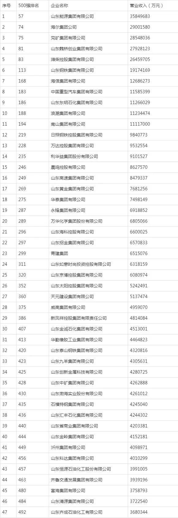 2020中国企业500强中,共有47家鲁企上榜。山东能源集团有限公司以3584.97亿元营收位居山东第一、榜单第57位。