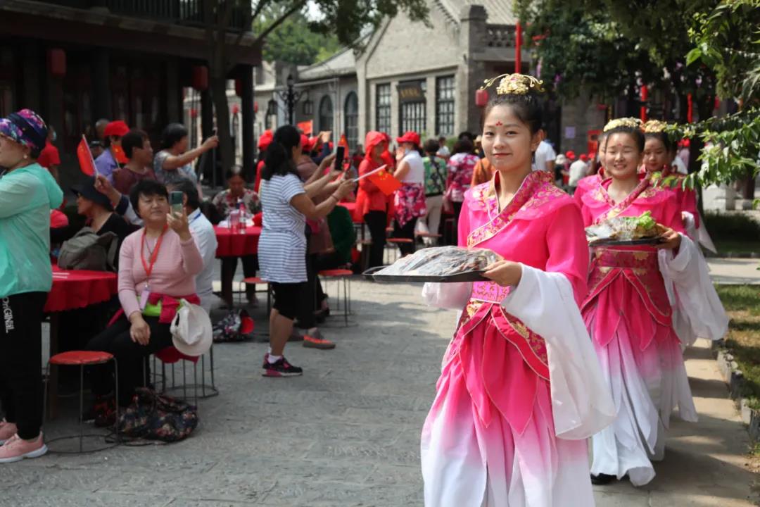 活动现场,古色古香的东阿阿胶城内摆起了蜿蜒的长龙宴,放眼望去一片喜庆的中国红十分亮眼。在开宴之前,上千名游客手举五星红旗,共起高歌《我和我的祖国》,全场激情澎湃,热血沸腾。伴随着开锣盛宴,一个个靓丽的阿胶姑娘,一位位俊俏的阿胶小伙,端着鲜美的驴肉宴登场。
