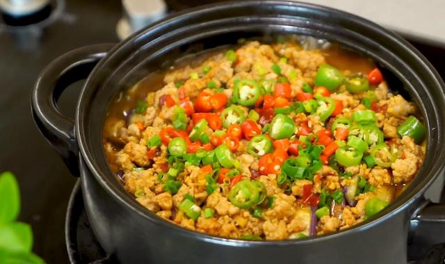 4、砂锅盖上锅盖,开中小火焖煮2分钟,2分钟后打开锅盖,倒入切好的小米椒、青线椒、葱花,盖上锅盖再焖煮1分钟,1分钟后就可以关火了,这道豆腐茄子煲就做好了,打开锅盖非常香,豆腐香辣入味,茄子一点也不油腻,非常好吃下饭。