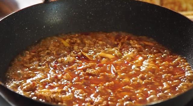 3、平底锅中再倒入适量食用油,油热倒入切好的肉末,不断翻炒出香味,然后倒入切好的姜末、蒜末,翻炒几下后下入一勺郫县豆瓣酱,不断翻炒出红油,然后开始调味,加入适量生抽、蚝油,翻炒均匀后加入一小半清水,开大火煮开,煮开后倒入砂锅中;