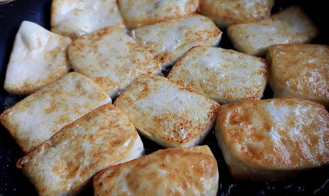 2、煎豆腐的时候,不要着急翻面,要等豆腐一面煎至金黄的时候再翻面,这样就不容易将豆腐弄碎,豆腐吃起来外焦里嫩口感好。
