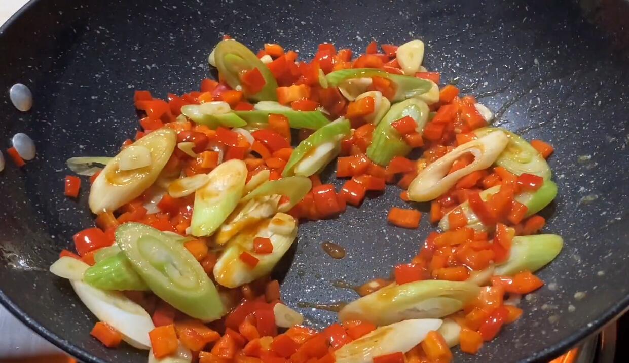 4、锅中留少量底油,油热下入切好的蒜片、红椒、大葱段,开中小火翻炒爆出香味,然后开始调味,加入适量食盐、蚝油、白糖提香,不断翻炒将调料化开;