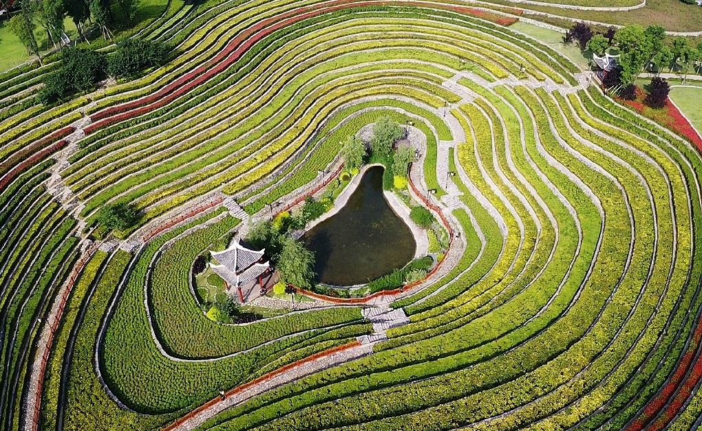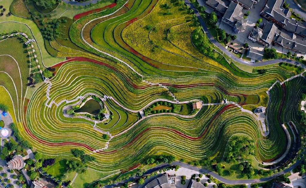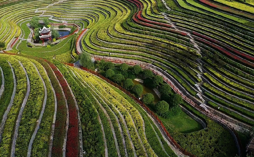 这其中,最吸引人的是古彝梯田。古彝梯田是一片建在奢香古镇城市中心的人造梯田,虽然是人造的,但真的特别美,像极了大地的指纹。这也是我见过的最漂亮的人造仿自然景观。其实,在2015年的时候,这里还是一片麻窝地,设计者在建造古镇的同时,将这片麻窝地建设成了一座贵州式的七彩梯田,成了中国唯一的城市花海梯田。