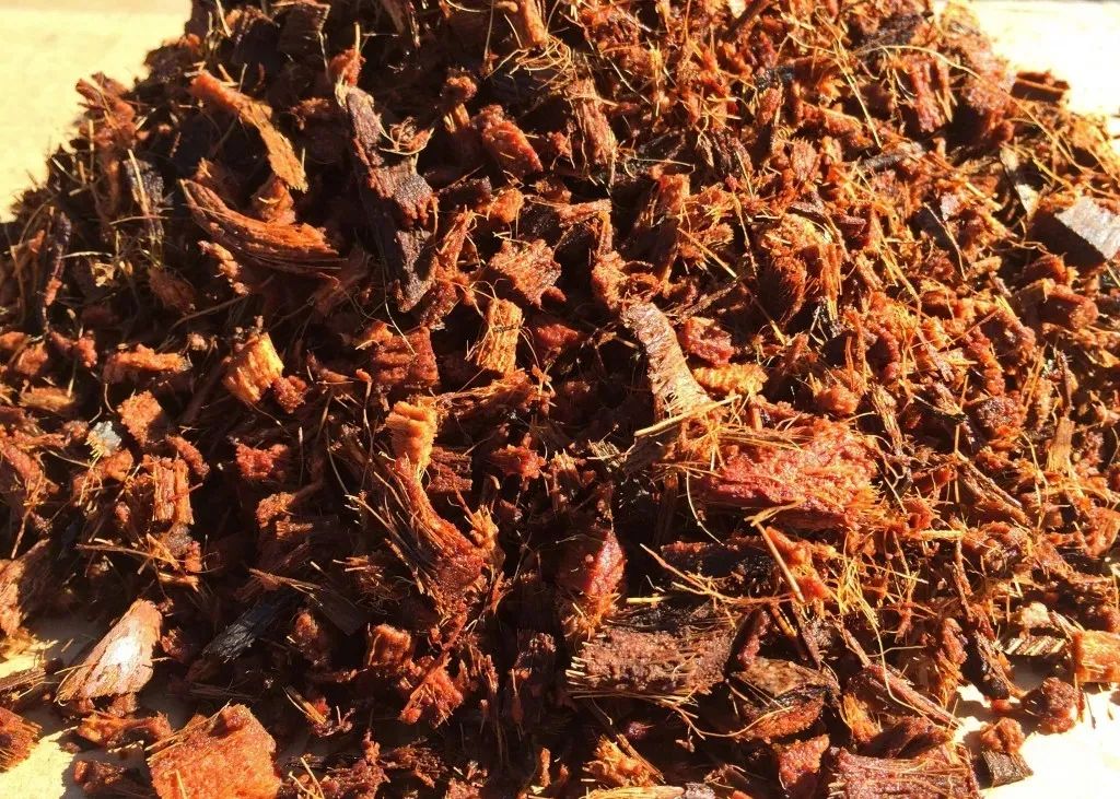 粗椰糠实际上就是椰子外壳上的纤维,就是在制作细椰糠时,会有一些残渣和一些比较粗的块状物质,这些就是粗椰糠,它其实就相当于我们以前用来养花时会添加的树皮,就包括我之前经常会用到的松鳞,也就是松树皮。如果你能收集到松树皮,那就可以用来代替粗椰糠了。