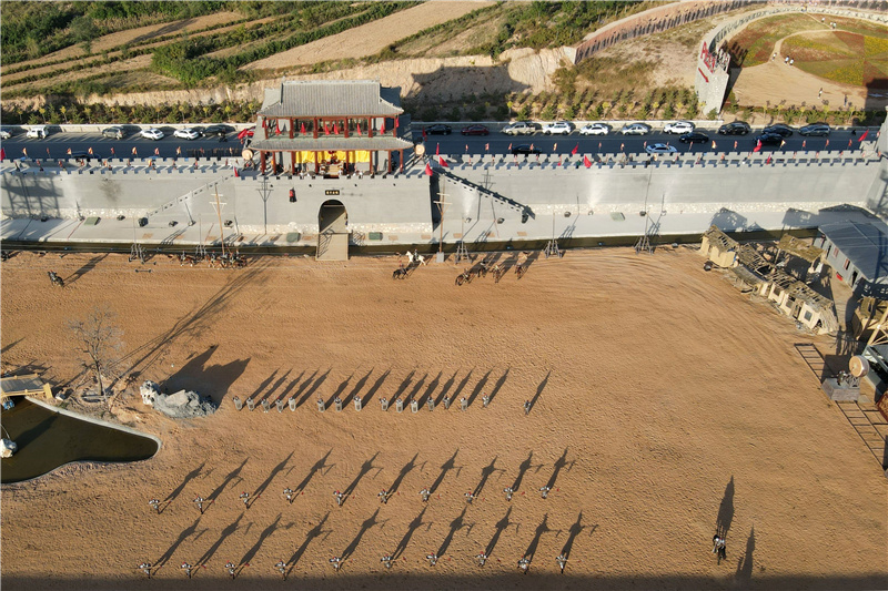 10月4日,演员在河北省临城县表演“赵子龙大战长坂坡”(无人机照片)。