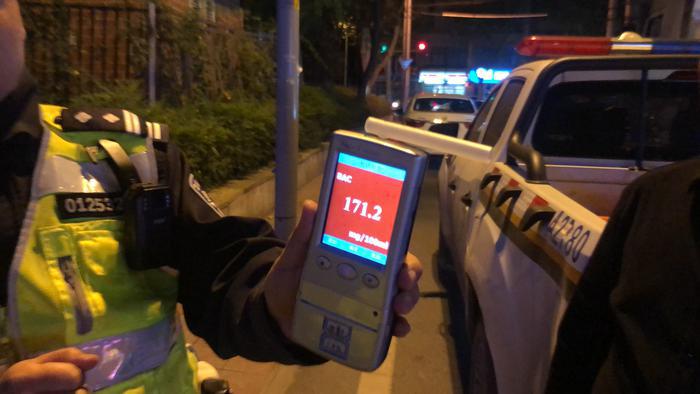 大约半个小时后,同一地点驾驶员张某某驾驶一辆银色小型轿车看见盘查点想要绕过去时,被执勤民警拦下。经现场呼吸式酒精测试仪测试,张某某血液酒精含量高达171.2mg/100ml,涉嫌醉驾。张某某下车时,走路已经东倒西歪。例行完现场调查程序后,张某某被执勤民警带往医院进行更为精确的血液监测,而等待他的或将是“牢狱之灾”。