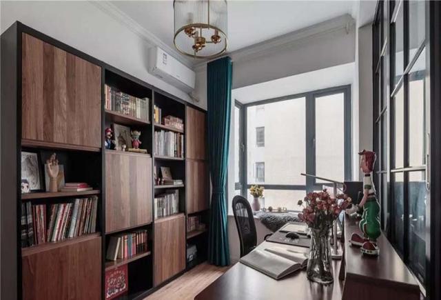 书房的整体色调区别于客厅的灰绿复古色调,以木色、黑色和绿色为主。靠墙一排书柜,满足日常收纳需要。