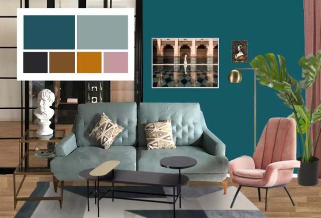 墙色选择了深灰绿与浅灰的搭配,融合浅蓝色的沙发形成同一系列的冷色调,同时又和脏粉色单人沙发和窗帘形成撞色,让整个空间气质更为沉稳内敛。