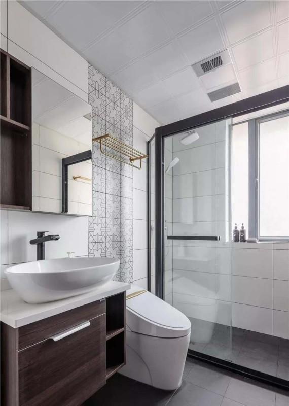 卫生间使用白色瓷砖点缀了一点小花砖,空间上更加俏皮可爱,通体使用白色的洁具,在整体上也干净整洁。
