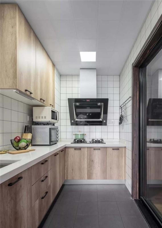 厨房空间比较宽裕,墙面用的是白色小方砖,加上原木色柜体,整体感觉非常好看大方。