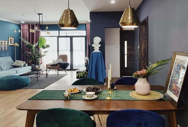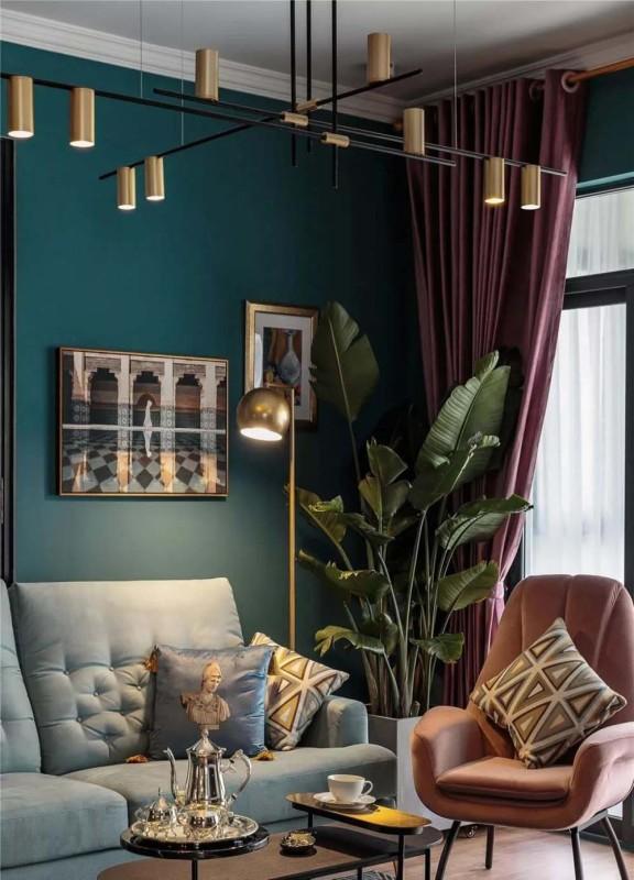 在整体风格上,也并没有完全固定统一,而是讲究混搭带来的时尚空间。丝绒质地的沙发融入北欧风绿植,搭配金属复古的落地灯,精美的挂画构成了一个既复古又轻奢的混搭客厅。