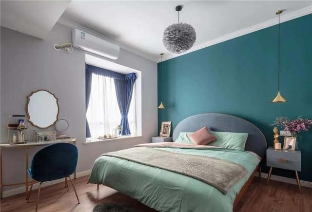 卧室靠床那个墙面是复古绿色,四周是浅灰色。主灯用的是非常有造型感的羽毛灯,营造出一种静谧温柔的气氛。