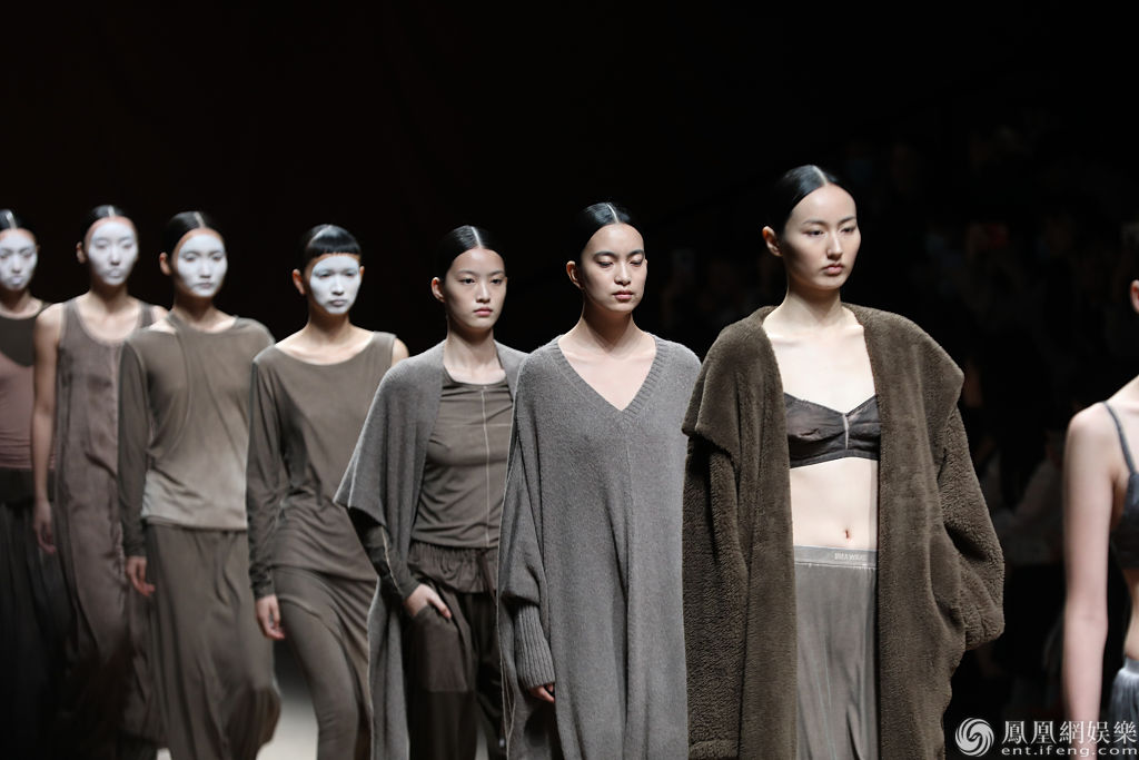 2020年10月11日,上海,2021春夏上海时装周,UMA WANG X三枪发布秀。众多模特登台走秀。