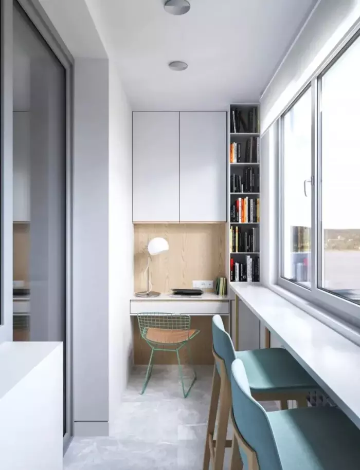 前面我们提到了,就是在阳台这里做吧台的两种形式,下面的这种形式,是靠在窗户旁边做个吧台,主要是用来做书桌使用,而且窗户这里的光线也比较好,不管是办公还是阅读,感觉都会很不错的。