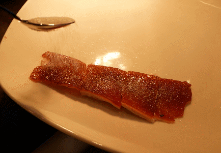 烤乳猪分麻皮和光皮两个流派,口感和吃法也是不同的。由于油脂的参与,麻皮乳猪表现出来是酥,而光皮乳猪表现出来的是脆。在吃法上,光皮乳猪一般连肉吃,而麻皮乳猪是先吃皮再吃肉——连着肉吃,皮的酥彰显不出来!配了一碟甜面酱和一碟白糖,应该先蘸甜面酱再蘸糖,这样糖才附着得上,而夹上一片小面皮,既去腻又彰显了酥脆,软绵绵的小面皮是参照物,没有对比,就没有伤害啊!