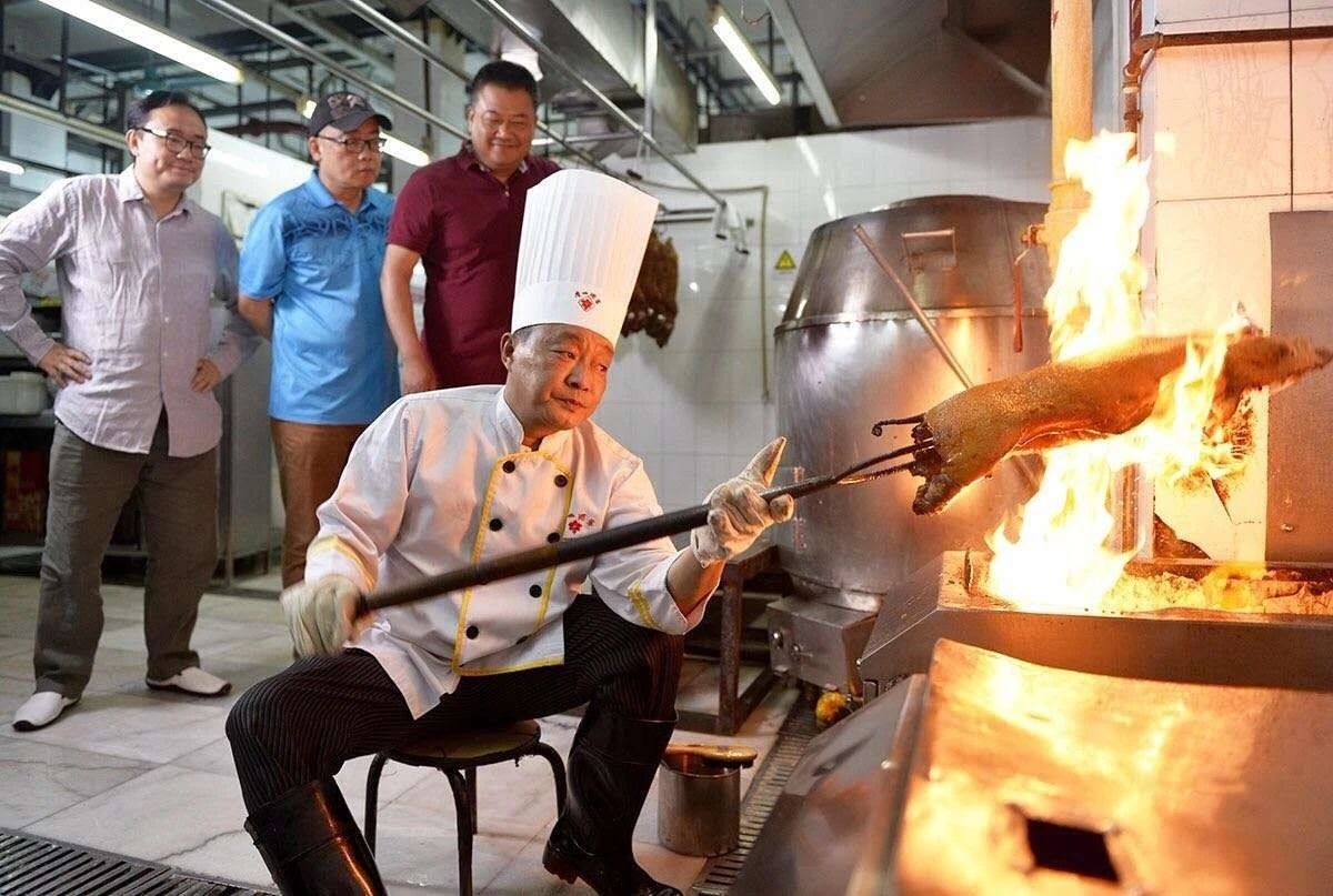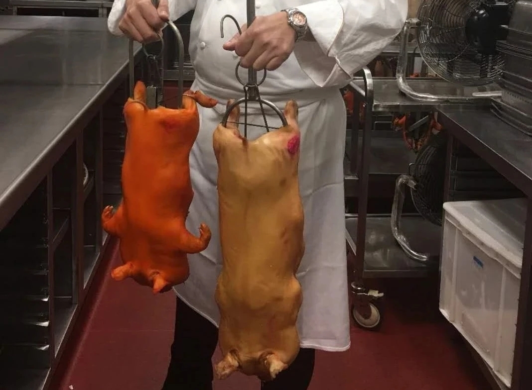制作一只色泽红润,形态完整,皮酥肉嫩,肥而不腻,入口奇香的烤乳猪,要经过一系列复杂的程序,非专业酒楼无法完成。
