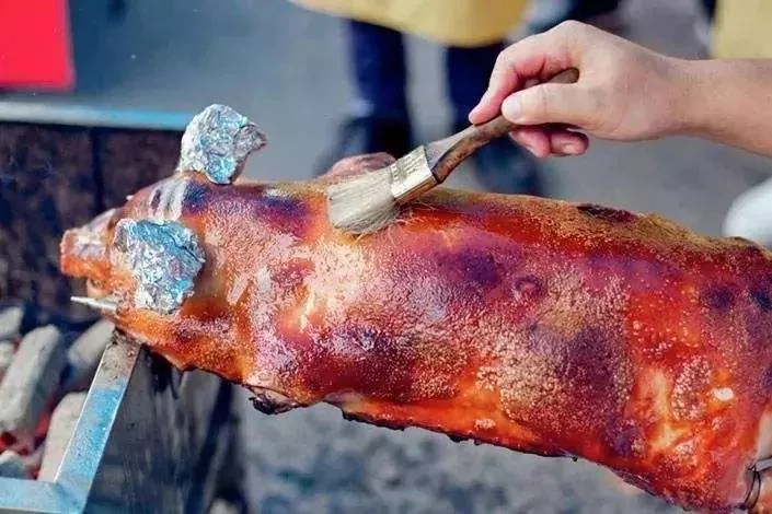 也有人在烤乳猪过程中给猪皮上油,再转猛火烤,也能变成麻皮。麻皮其实是猪皮在油的参与下高温加热的结果,相当于油炸猪皮,用钢针扎猪皮,是让猪肉的油脂跑出来,往猪皮刷油,也是让油参与,一烤,就起小油泡了。烧大猪不用钢针扎也不用往猪皮刷油,依然可以烧出麻皮的效果,那是因为大猪有足够的脂肪,流到猪皮里,自然就如油炸猪皮般了!