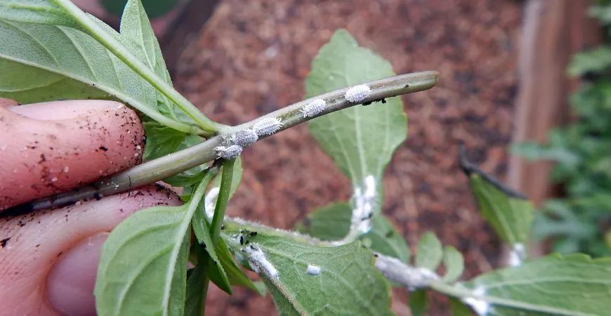 如果你发现植物的叶子开始发黄、枯萎,且植物的枝条上会出现一些白色的