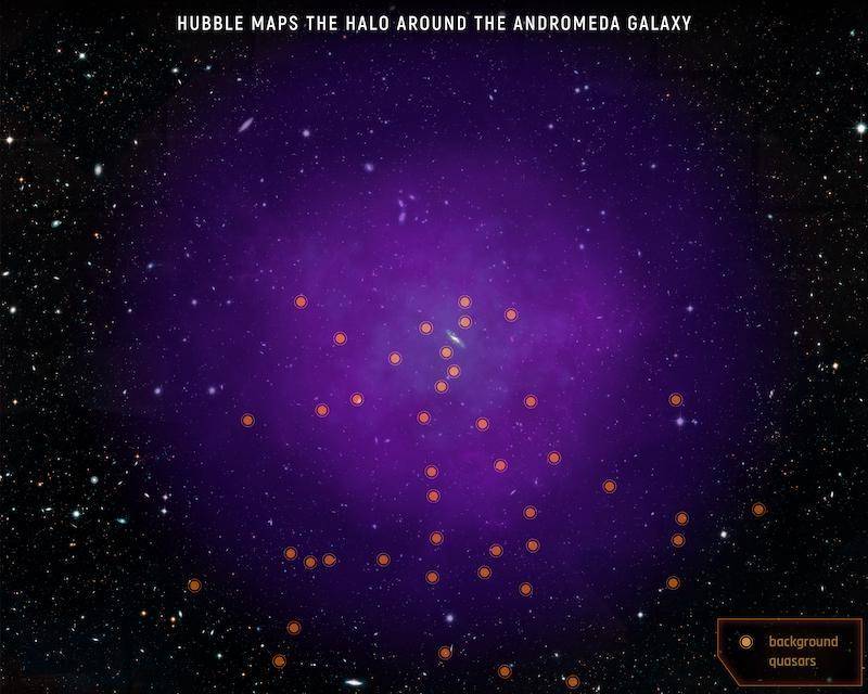 通过观察43个背景类星体,科学家用哈勃太空望远镜测定了仙女座星系的星系晕。来自遥远类星体(一类非常活跃明亮的由中央超大质量黑洞供能的星系)的光穿过仙女座星系晕的时候会被吸收,在星系晕不同的位置观察这种吸收的变化,科学家不仅可以“看到”这个巨大的星系晕,而且可以分析它的组成。图片来自NASA/ESA/E.惠特利