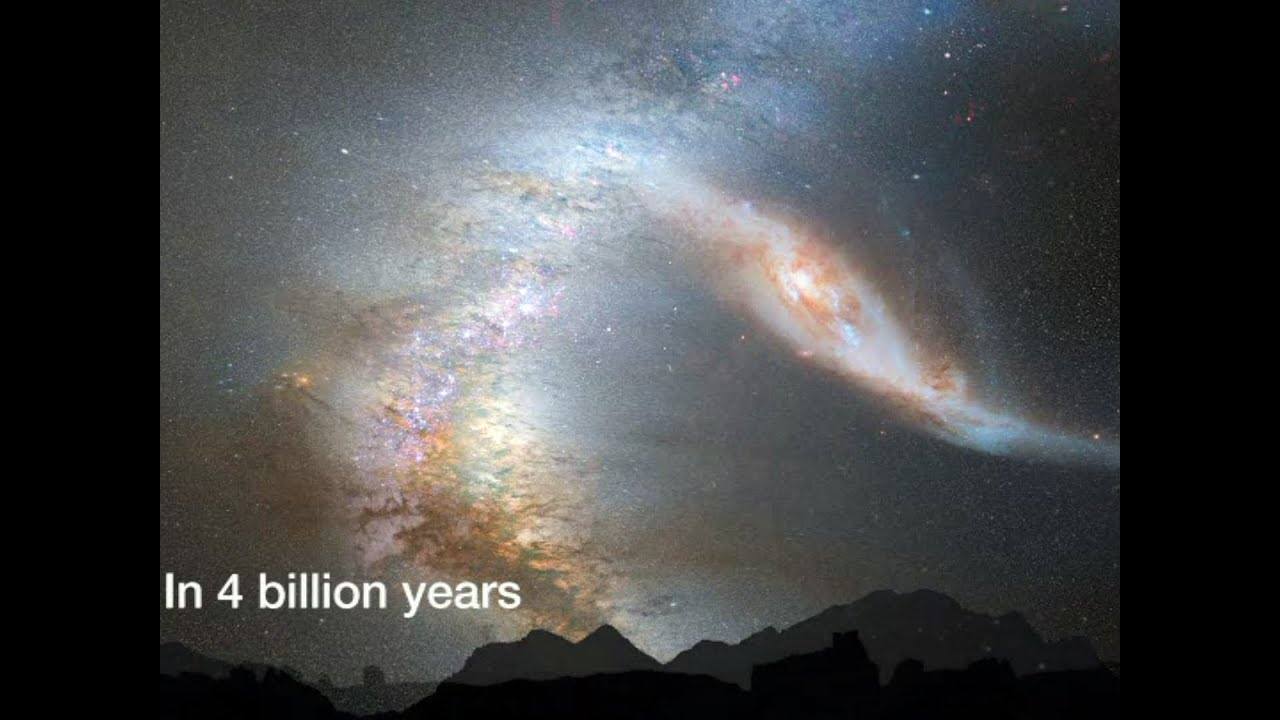 下图是在哈勃太空望远镜对仙女座星系的运动的观测数据的基础上,用电脑模拟未来两个星系的合并。2012年发表的一系列的研究表明,银河系和仙女座星系最终会合并成为一个更大的椭圆星系,而不是擦肩而过。