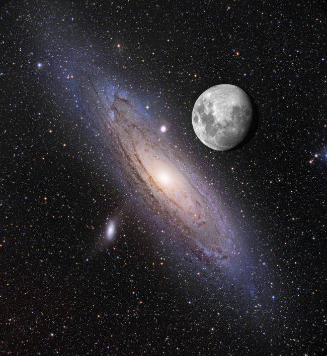 这是仙女座星系的真实大小吗?没错。这张图片真实描绘了,如果我们的比邻星系——仙女星系更亮一些的话,夜空看上去会是什么样子。背景中月亮的原始照片由斯蒂芬·拉恩( Stephen Rahn)拍摄,仙女座星系的图像来自美国航天局(NASA),图片由汤姆·巴克利-休斯顿(Tom Buckley-Houston)合成。这张合成图几年前出现在Reddit网站上。如果你不相信,可以看看APOD网站发布的同样的图片。