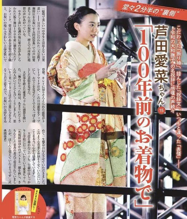 作为优秀到闪光的新生代艺人,去年在日本新天皇即位庆典上,15岁的爱菜受邀身着有100年历史的名贵和服上台念祝贺词。