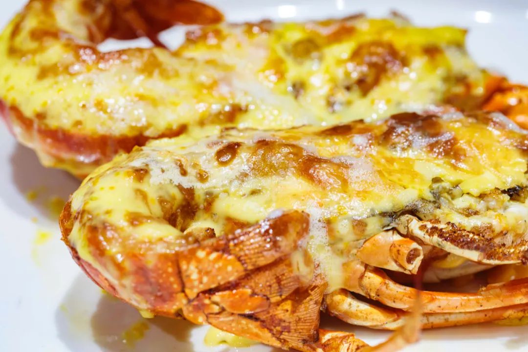 做法中西合璧的芝士焗小青龙,泛着油润的光芒,可惜吃多了有点小腻。
