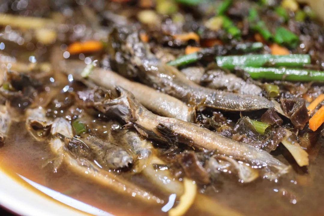 “黑黢黢”的梅菜跳跳鱼,台台是第一次吃。可能是因为跳跳鱼没有清理内脏,吃口有些苦,而且小的鱼刺还很多,倒是配着的梅菜更出彩。