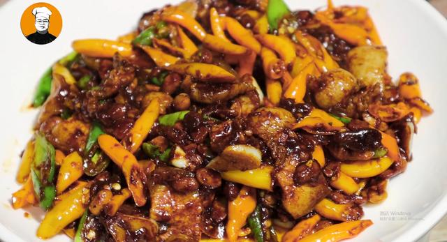 10、发酵时间到时,盛出一勺放入碗中。热锅倒油,放入五花肉煸炒出油,再放入自制豆豉、蒜片一起煸香,淋入少许生抽、老抽、料酒、白糖、味精,翻炒入味,再放入黄贡椒和线椒一起翻炒断生就可以出锅了
